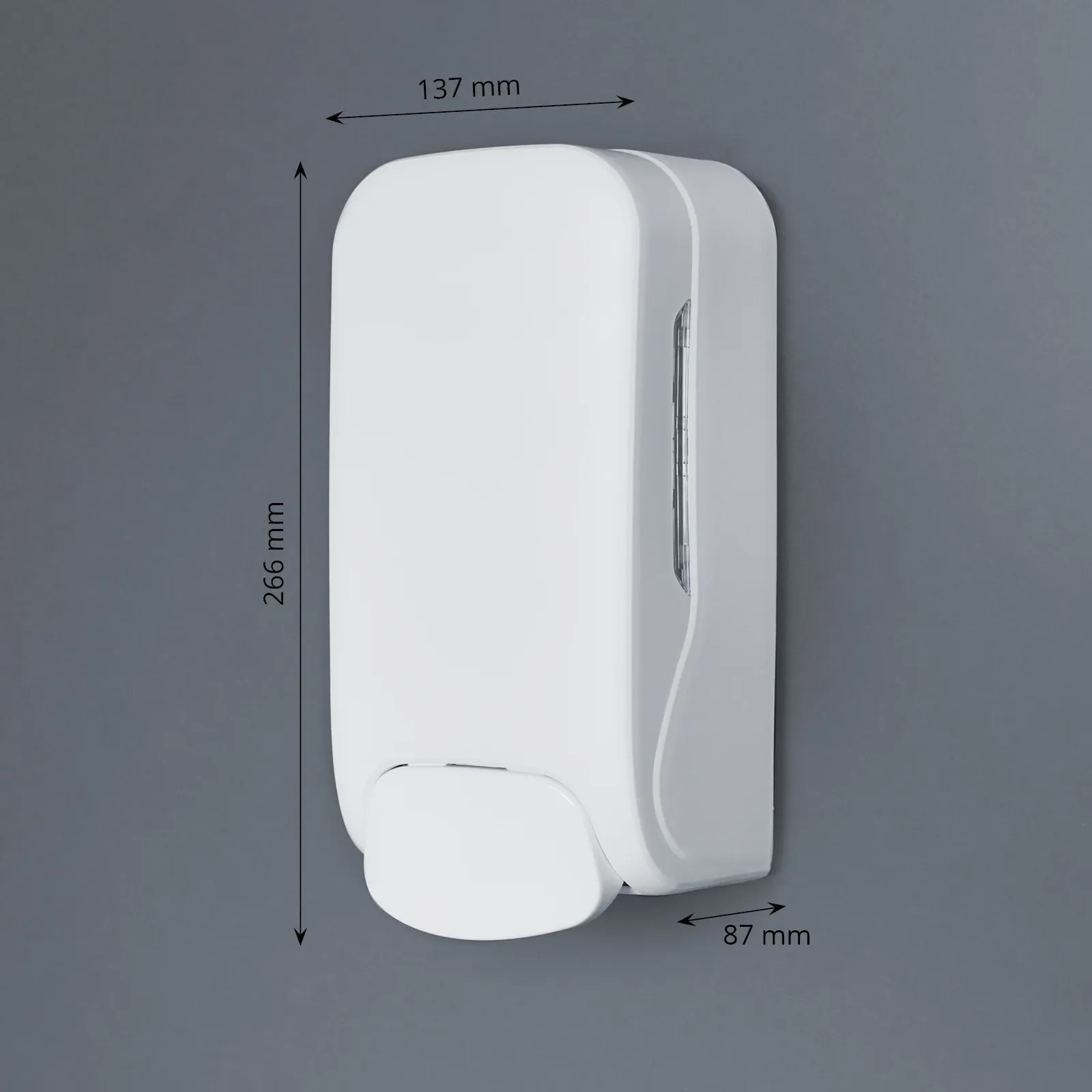 Entscheiden Sie selbst, welche Seife Sie einfüllen möchten. Dieser weiße Seifenspender psst in jede Sanitäranlage und besteht aus hochwertigem schlagfestem Kunststoff. Mit dem beigefügten Bohrplan ist der Spender schnell anzubringen und somit schnell Einsatz bereit. Die seitlichen Füllstandsanzeigen geben Auskunft über den Inhalt. Ein Blick genügt, um zu wissen ob eine Füllung mit Handseife notwendig ist. Der passende Schlüssel verhindert unbefugtes öffnen.