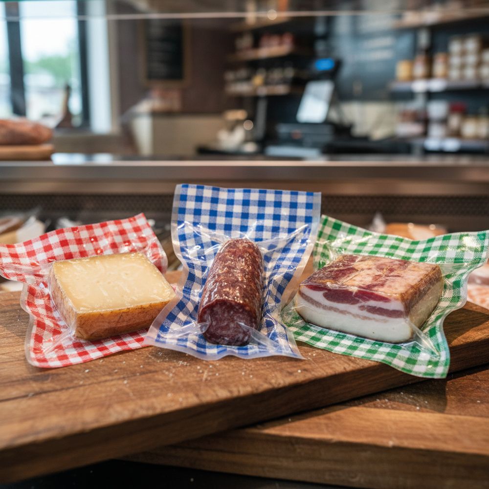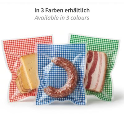 Verpackte Lebensmittel sehen mit diesen Vakuumbeutel im Karomuster sehr appetitlich aus. Die Siegelrandbeutel sind rundum verschweißt und bestehen aus mehrlagiger PA/PE Folie. Die Vakuumierbeutel sind äußerst stabil und somit perfekt zum vakuumieren, einlagern und einfrieren geeignet. Lebensmittel halten länger frisch, sind hygienisch verpackt und sind vor Aromaverlust sicher geschützt. Die transparente Vorderansicht sorgt für den nötigen Durchblick auf die Ware, während die Rückseite mit dem Karomuster zur Attraktivität der verpacken Ware beiträgt. Unterschiedliche Farben sorgen für die Unterscheidungskraft.